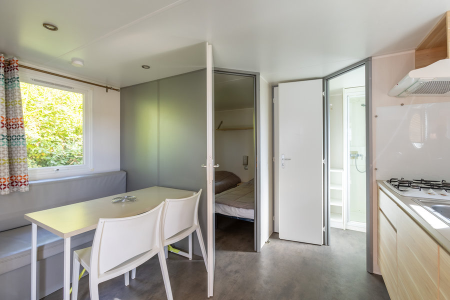 Coin salon/cuisine : cuisine équipée (évier, feux gaz, réfrigérateur, cafetière, micro-ondes, vaisselle), chauffage dans le séjour.