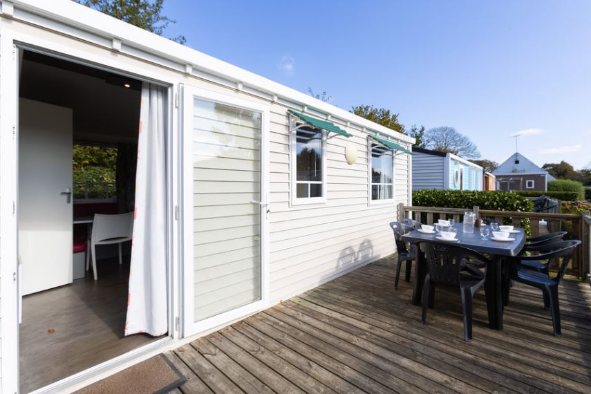 Extérieur : terrasse en bois avec parasol et salon de jardin.