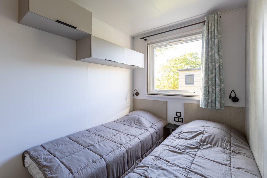 Coin nuit : Une chambre avec 1 lit double (160×200), une chambre avec 2 lits simples (80×190) côte à côte, oreillers et couettes fournis.