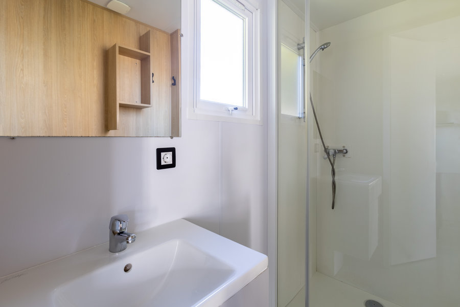 Sanitaire : salle d’eau avec douche et lavabo, WC séparé.