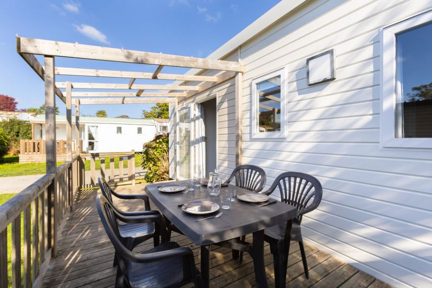 Extérieur : terrasse en bois semi-couverte et salon de jardin.