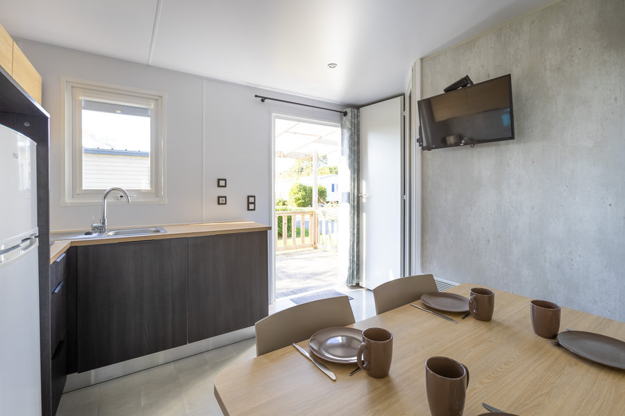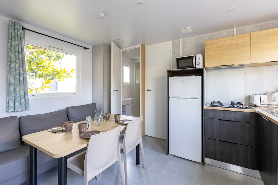 Coin salon/cuisine : cuisine équipée : évier, feux gaz, réfrigérateur/ congélateur, cafetière à filtre, micro-ondes, vaisselle, chauffage dans le séjour et TV.
