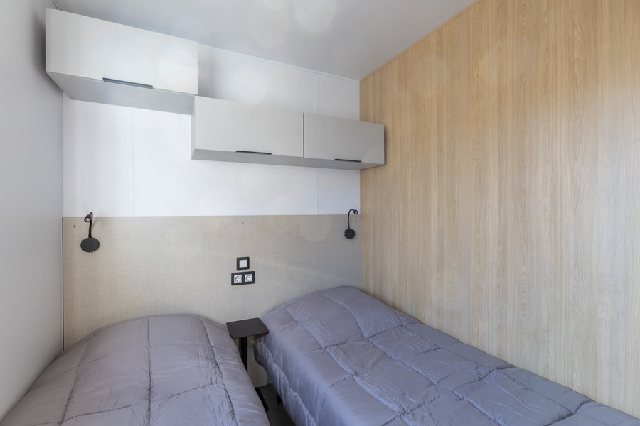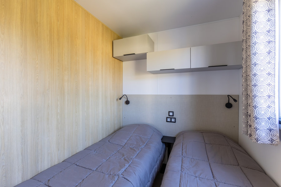 Coin nuit : une chambre avec 1 lit double (160×190), deux chambres avec 2 lits simples (80×190) côte à côte, oreillers et couettes fournis.