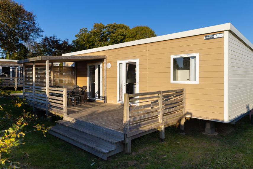 Extérieur : terrasse en bois semi-couverte, salon de jardin et 2 bains de soleil ou transat.
